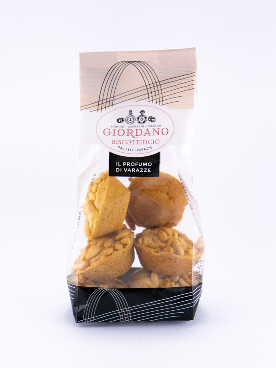 Ingredienti : Le Pinolate di Giordano sono pasticcini della tradizione dell’entroterra ligure, molto profumati, dove si percepisce un grande equilibrio tra mandorle e pinoli. L’impasto prevede la lavorazione a mano ed un’attenta cottura in forno che ne esalta la qualità.